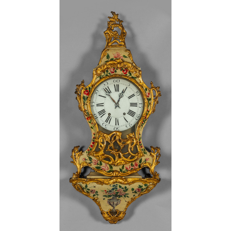 Cartel Luigi XV in legno laccato in policromia a fiori su fondo bianco ricca decorazione in metallo dorato macchina con ripetizione Piemonte sec.XVIII