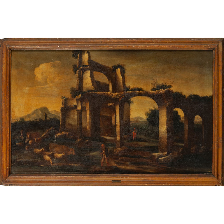 Scuola di A.Travi 'Paesaggio con rovine animato da figure e animali'olio sec.XVIII