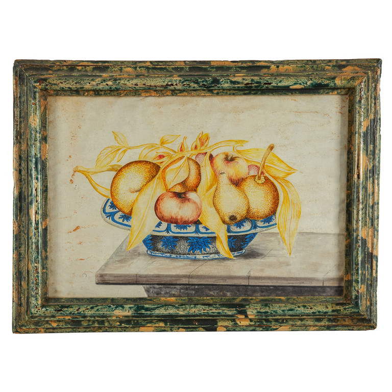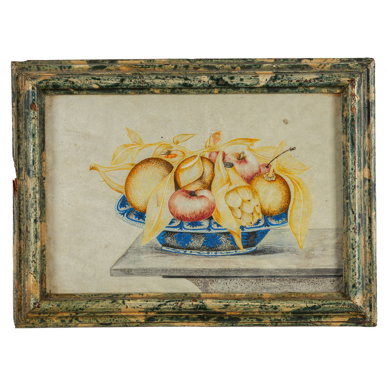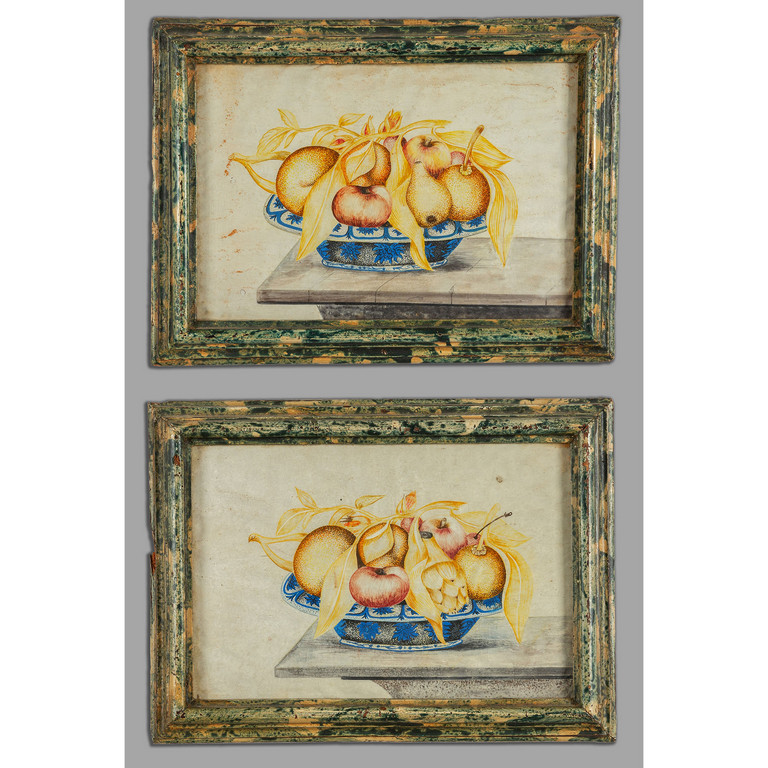 Scuola piemontese sec.XVIII 'Cesti di frutta' coppia di tempere su pergamena cornici antiche in legno marmorizzato