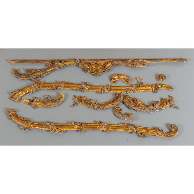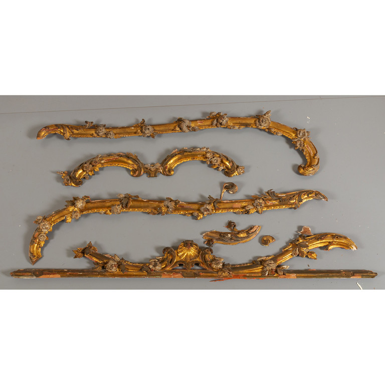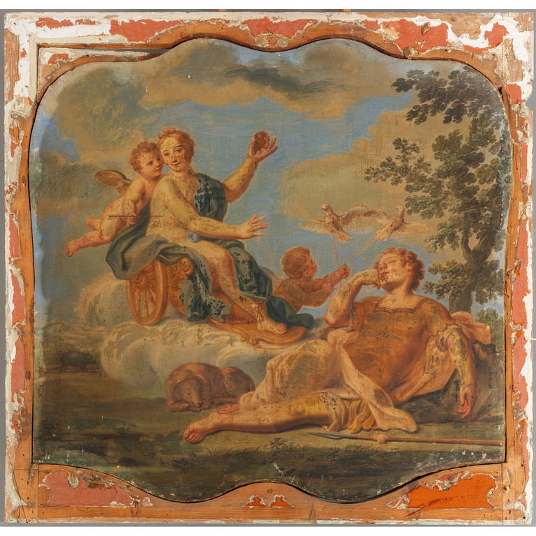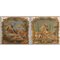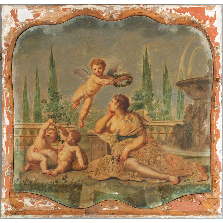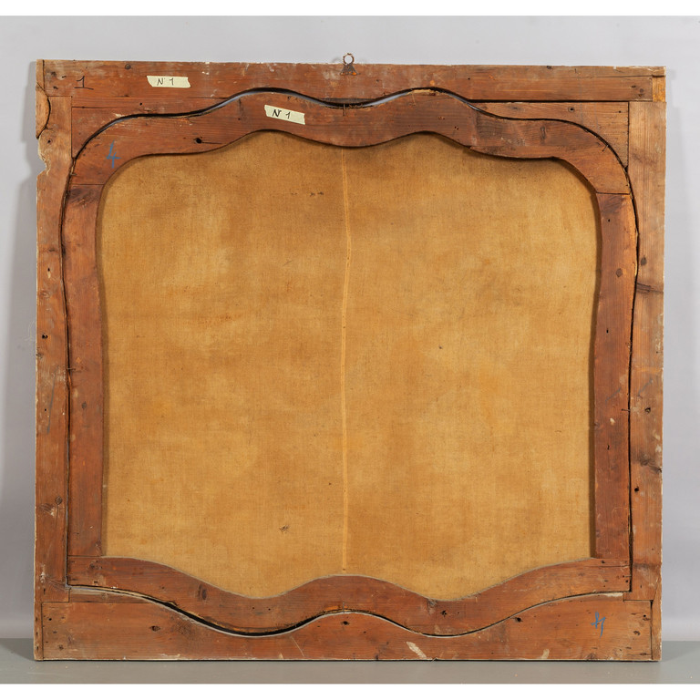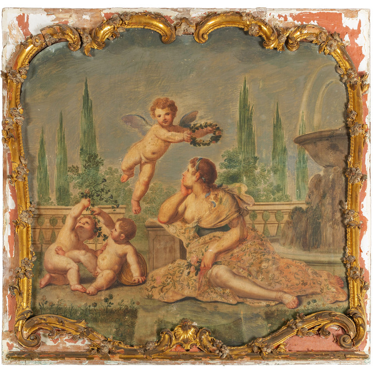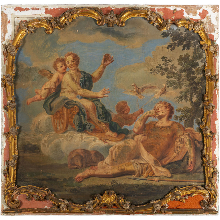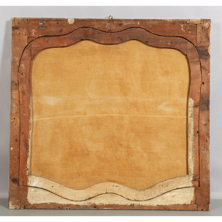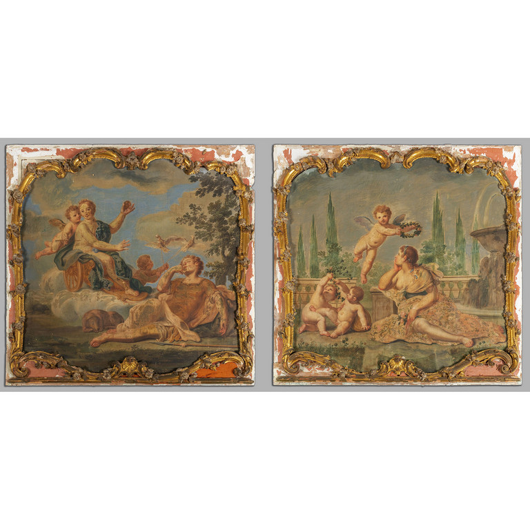 Scuola italiana sec.XVIII 'Scene mitologiche' coppia di tempere di forma sagomata belle cornici coeve in legno intagliato e dorato smontate e con mancanze