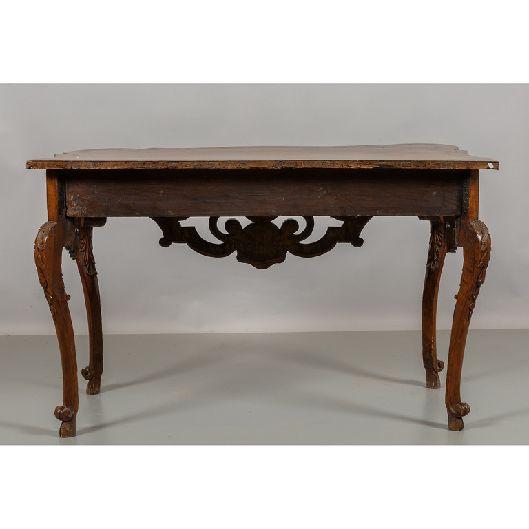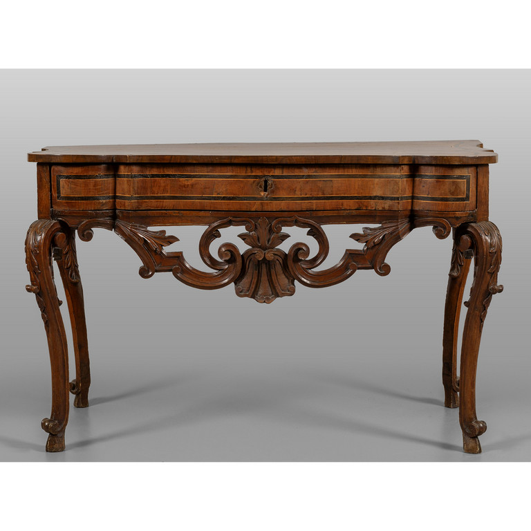 Console lastronata in noce e filettata in legni vari movimentata sul fronte cassetto nella fascia Veneto I metà sec.XVIII