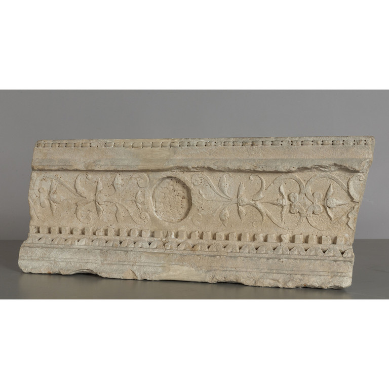 Frammento di trabeazione in pietra bianca scolpito a motivi floreali sec.XVI