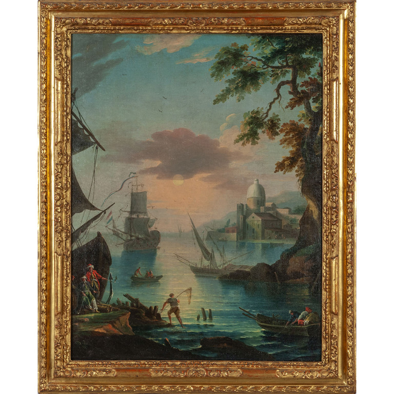 Scuola veneta sec.XVIII 'Marina con barche e figure' olio cornice coeva in legno intagliato e dorato