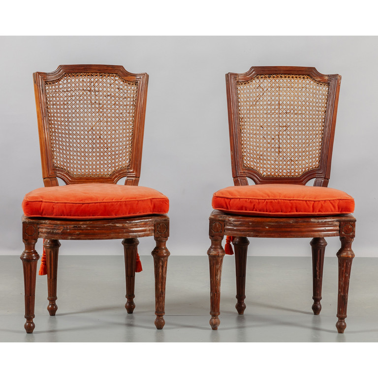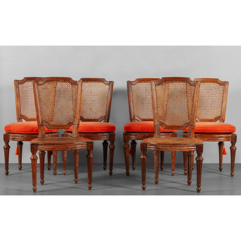 Sei sedie Luigi XVI in noce schienale a scudo gambe scanalate e controscanalate Genova II metà sec.XVIII