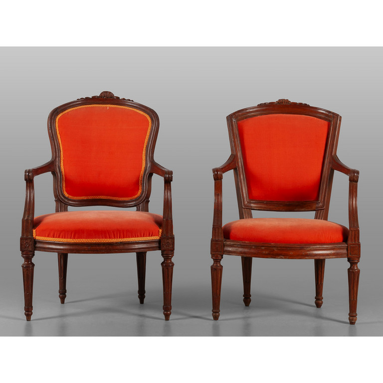 Due poltrone Luigi XVI in noce schienale a scudo gambe scalate e controscanalate Genova sec.XVIII