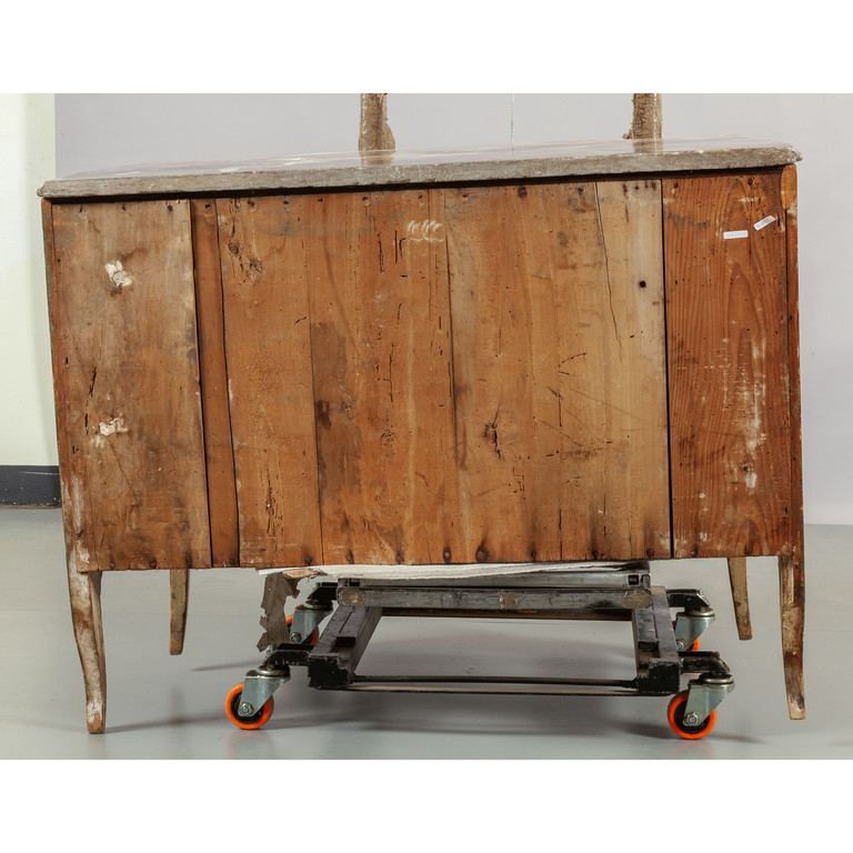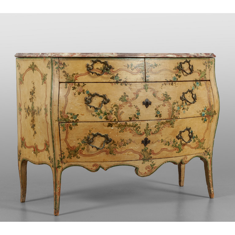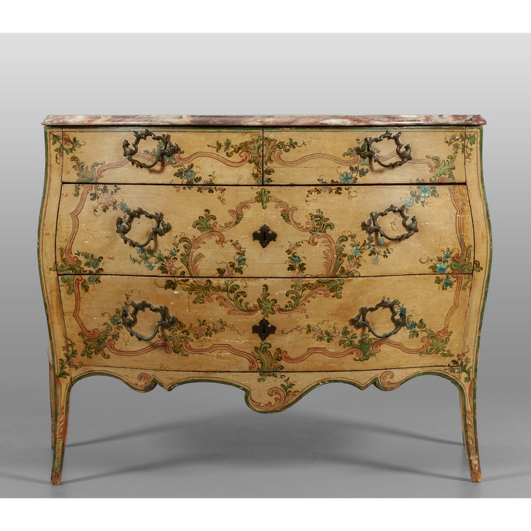 Comò Luigi XV a due cassetti più due laccato a fondo bianco con decorazioni a fiori piano in marmo Genova sec.XVIII