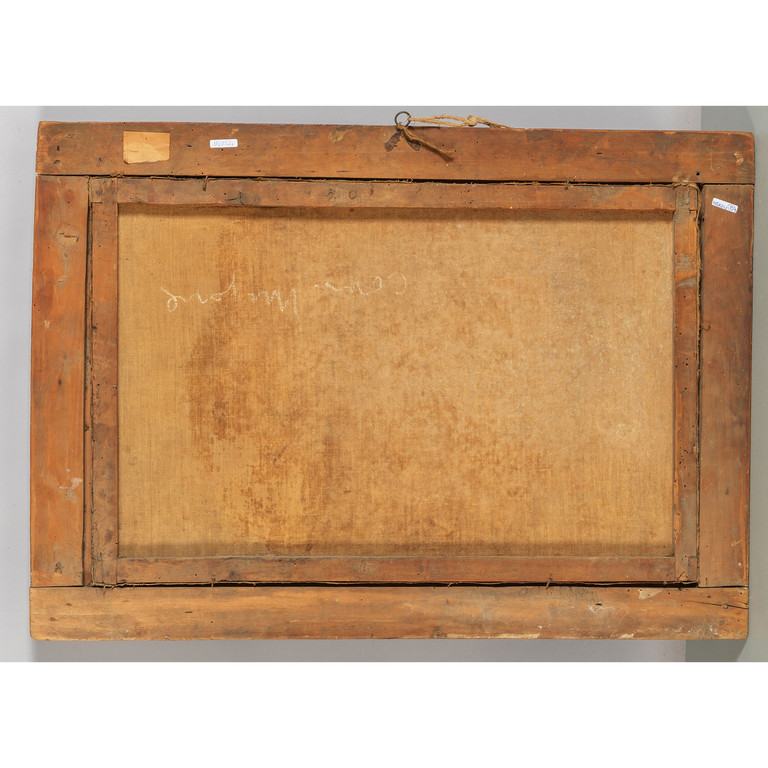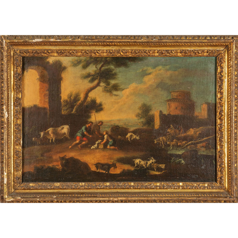 Scuola veneta sec.XVIII 'Paesaggio animato con figure e pastori' olio cornice coeva in legno intagliato e dorato