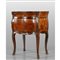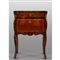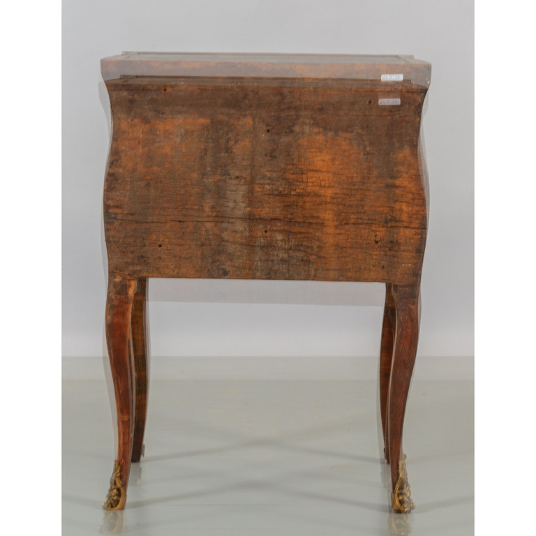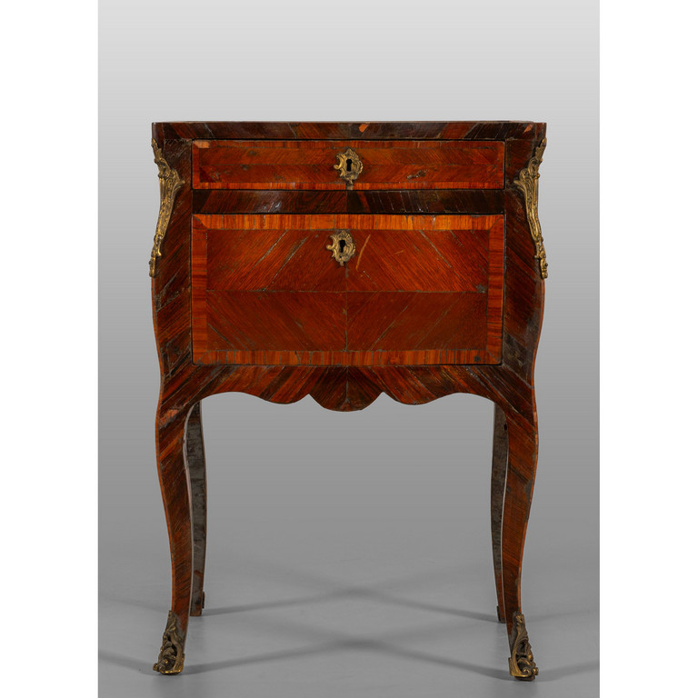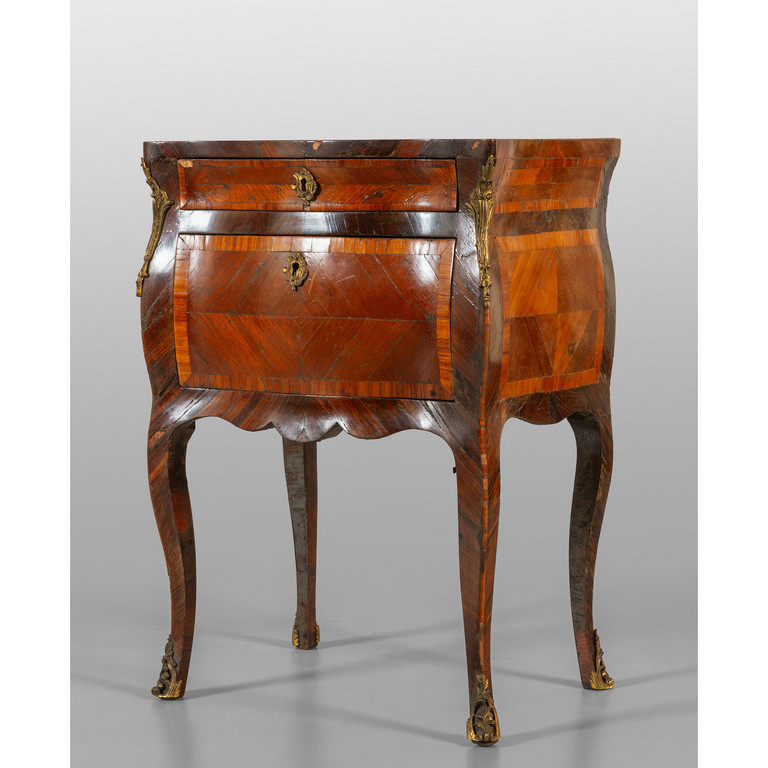 Comodino Luigi XV a gambe alte movimentato sul fronte e sui fianchi un cassetto piccolo e uno più grande lastronato in palissandro e legno di rosa con applicazioni in bronzo dorato Roma I metà sec.XVIII