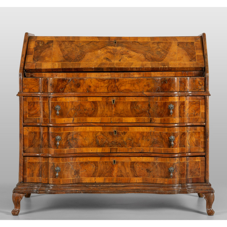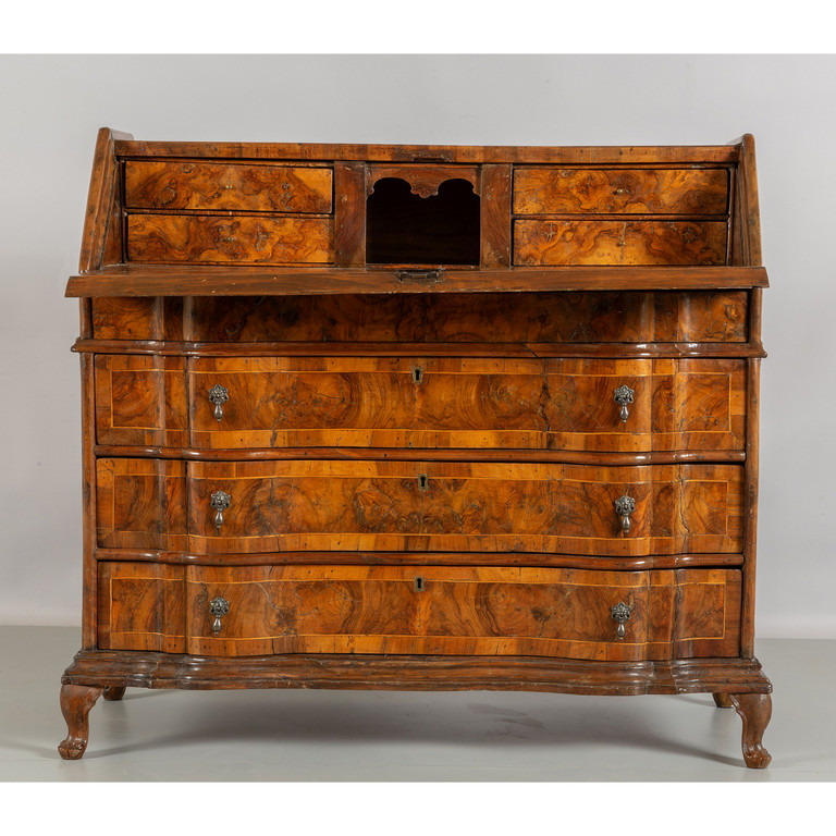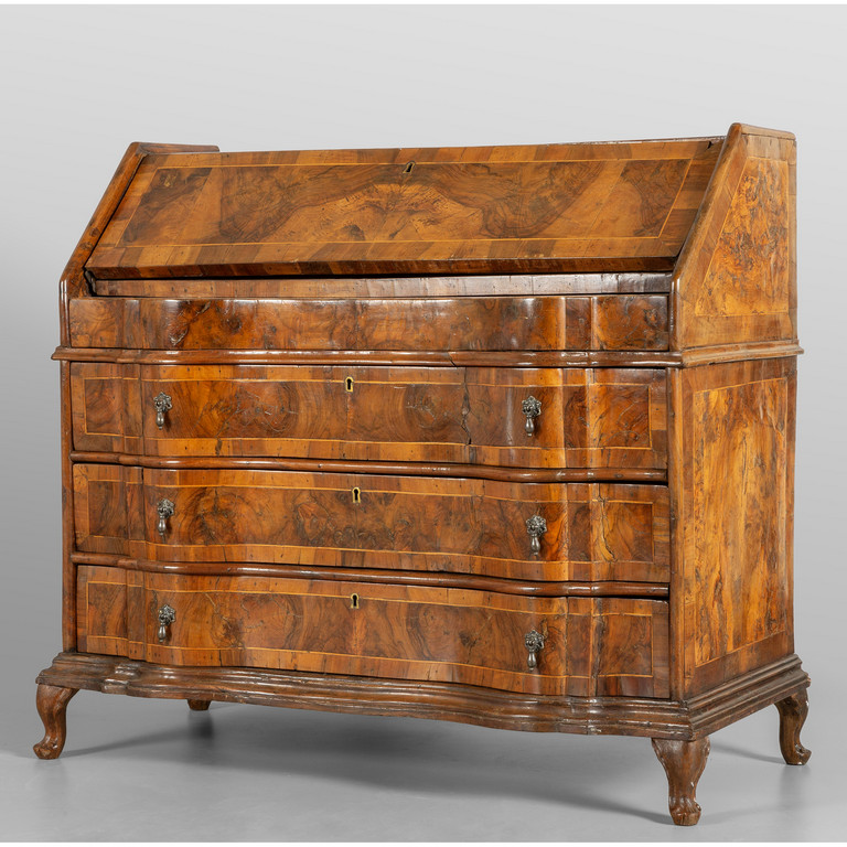 Ribalta movimentata sul fronte a doppia mossa lastronata in radica e filettata Veneto I metà sec.XVIII