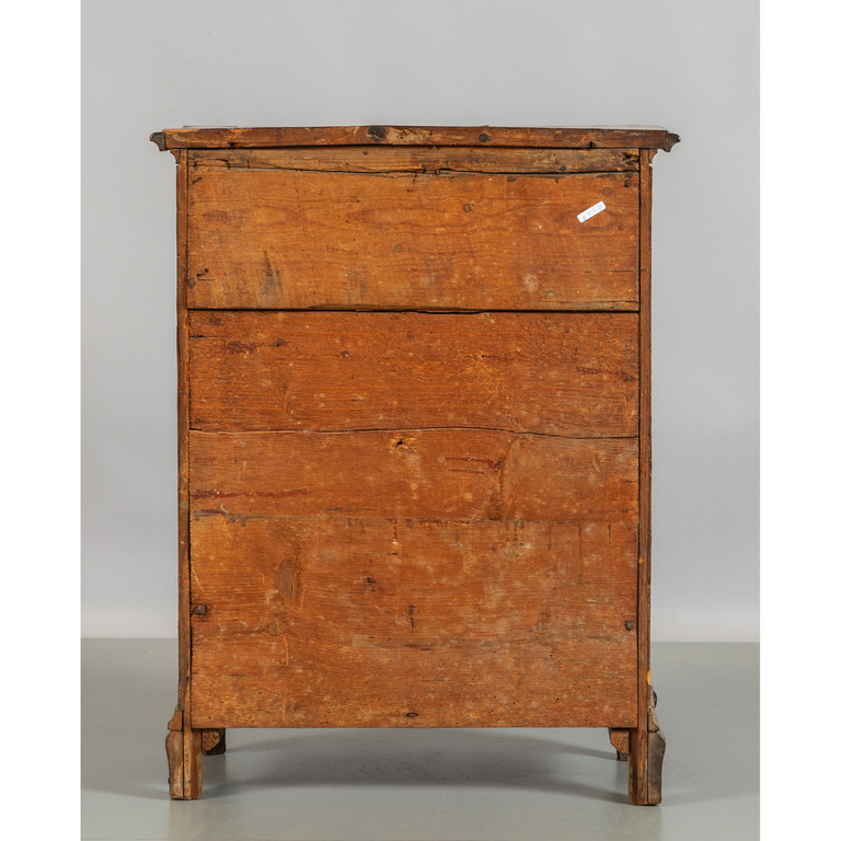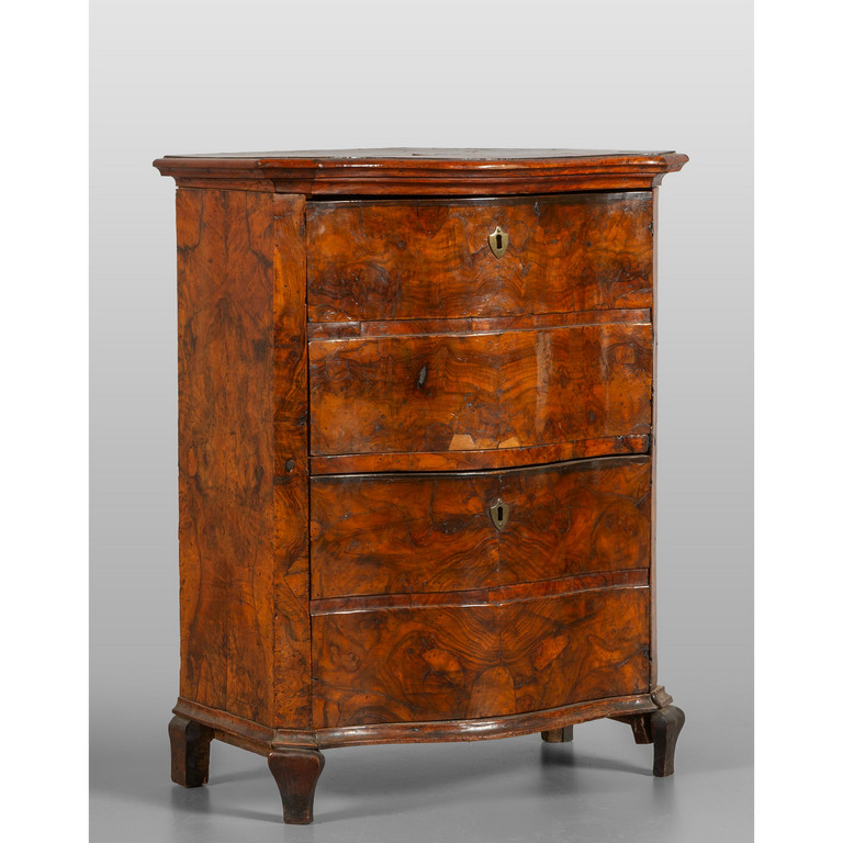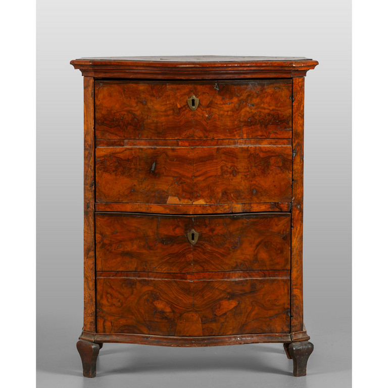 Comodino Luigi XIV lastronato in radica due cassetti doppi sul fronte Veneto sec.XVIII