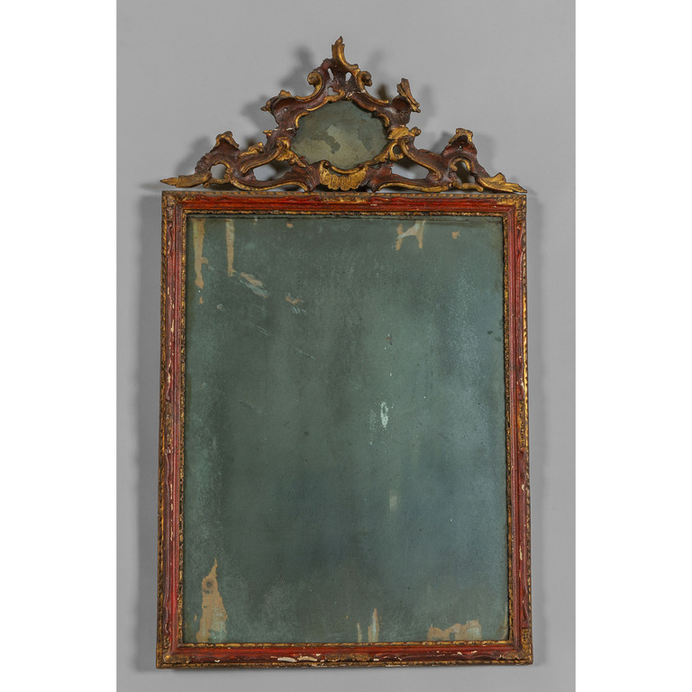 Specchiera Luigi XV in legno intagliato laccato rosso e dorato Venezia metà sec.XVIII