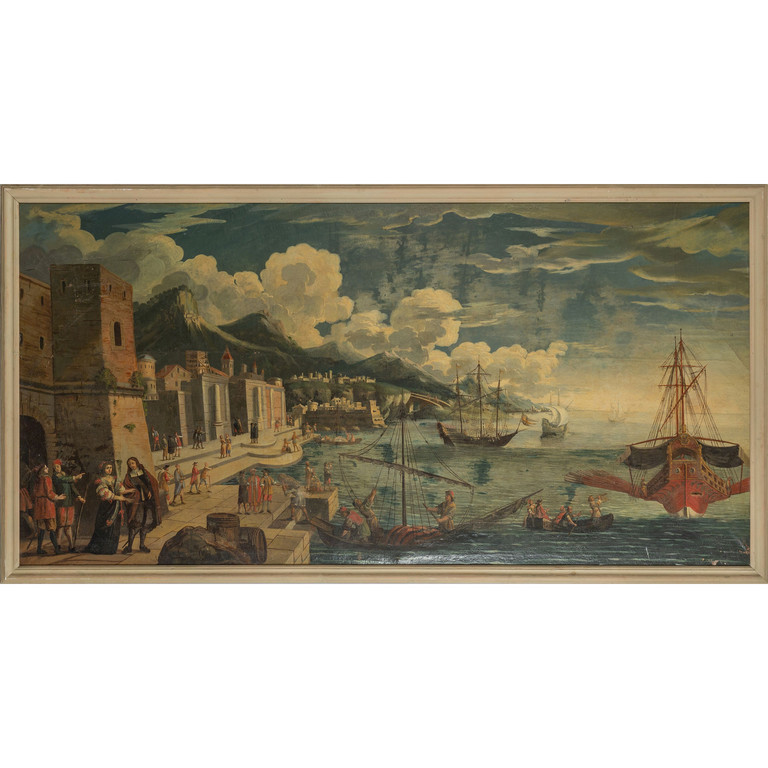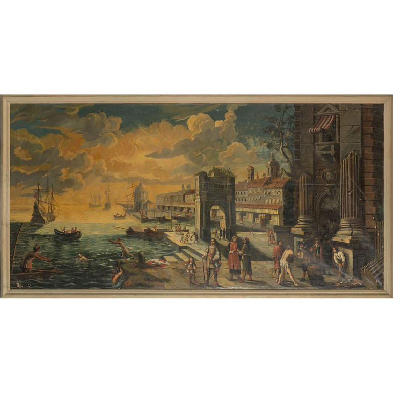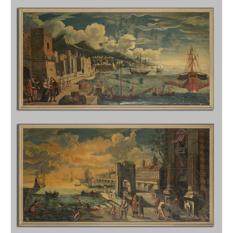 Scuola italiana sec.XVII 'Vedute di porti animati' coppia di olii