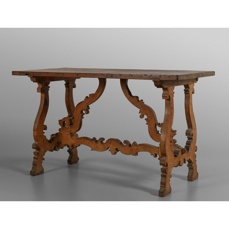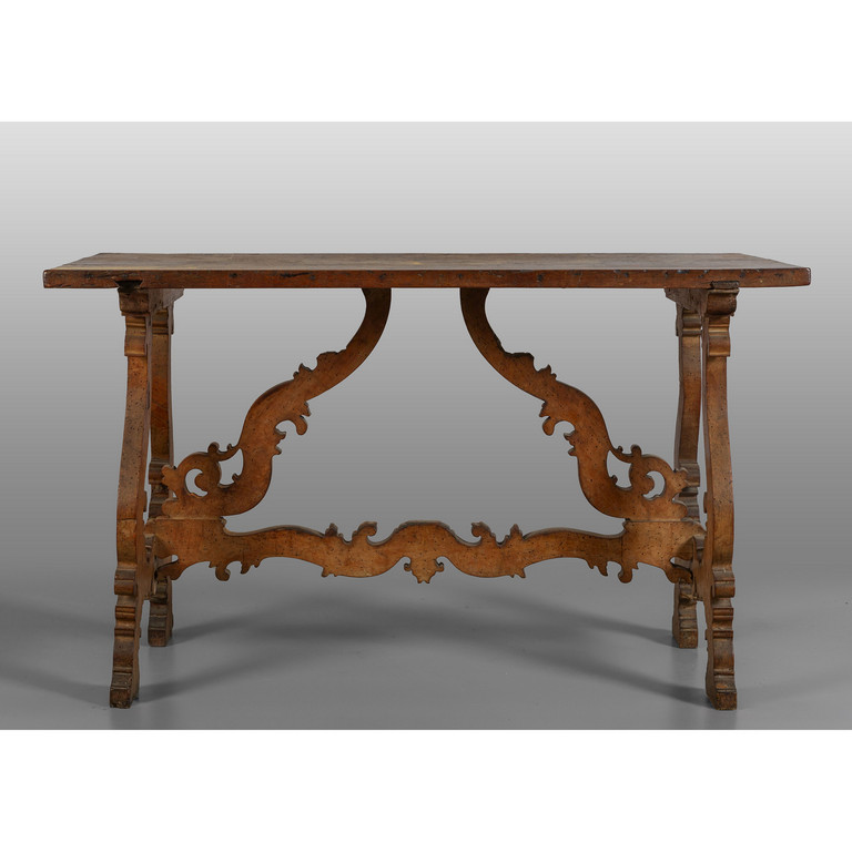 Tavolo a fratina in noce gambe a lira raccordate da traverse sec.XVII