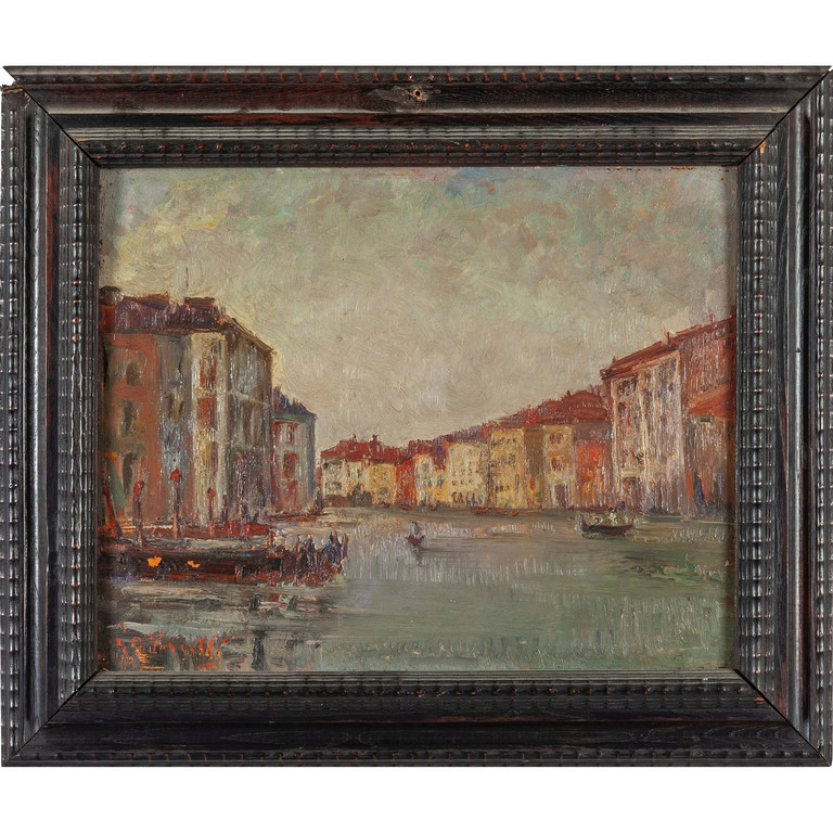 Scuola italiana inizi sec.XX 'Veduta di Venezia' olio su cartone f.to in b. a s.