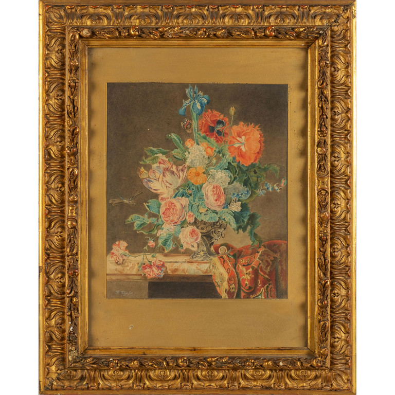 'Fiori in un vaso su un davanzale' acquarello su cartone f.to in b. a s.
