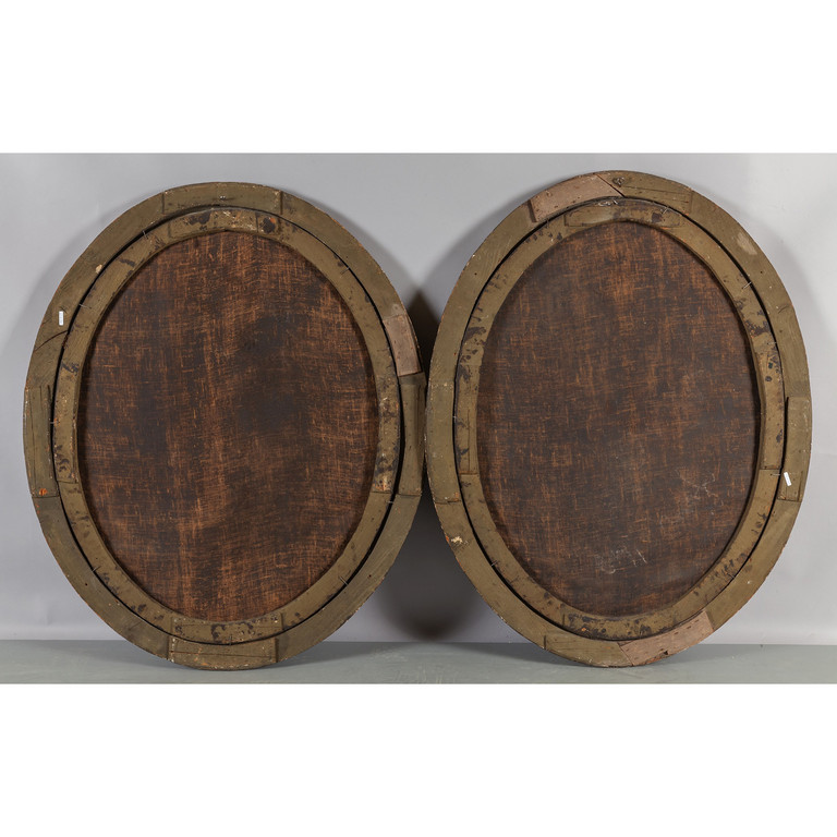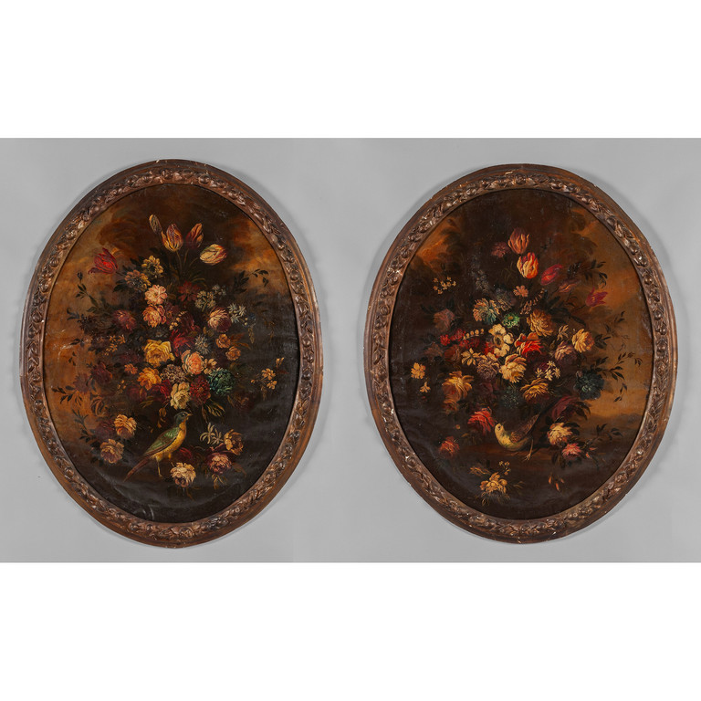 'Nature morte con fiori e uccelli' coppia di olii di forma ovale fine sec.XIX