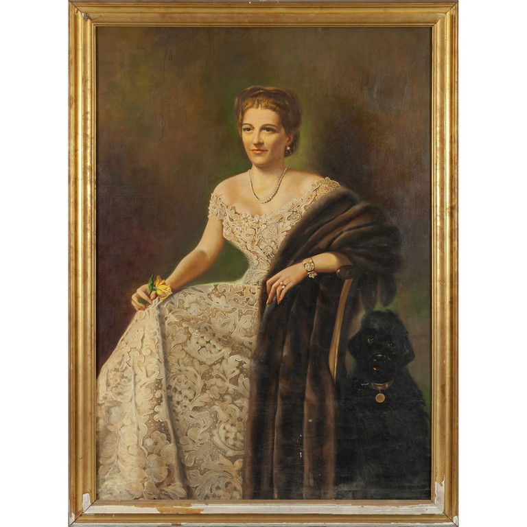 Scuola italiana inizi sec.XX 'Signora con abito di pizzo pelliccia ed un barboncino' olio