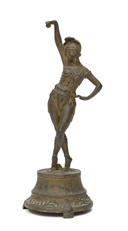 a patina brunita, raffigurante ballerina dell'epoca. Base circolare decorata a motivi vegetali.