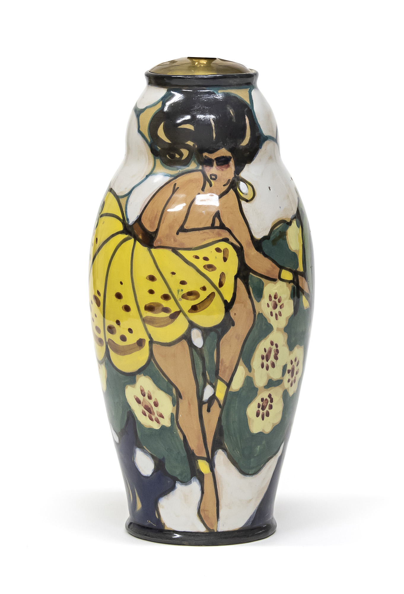 a smalti policromi con decori a figure in sequenza di ballerina tra i fiori. Finitura in ottone.