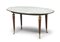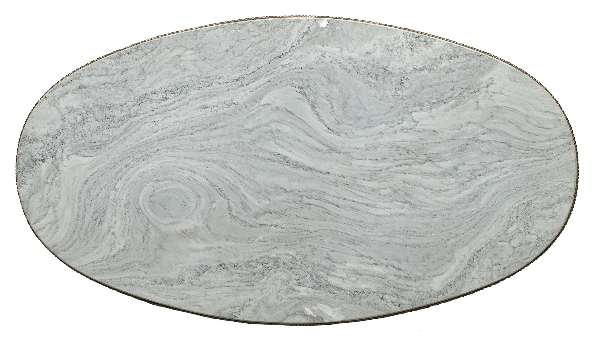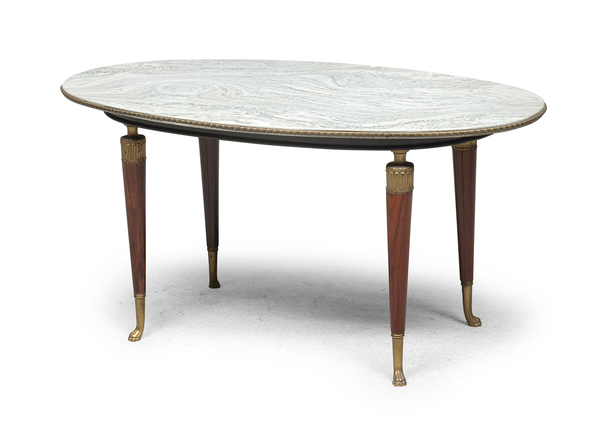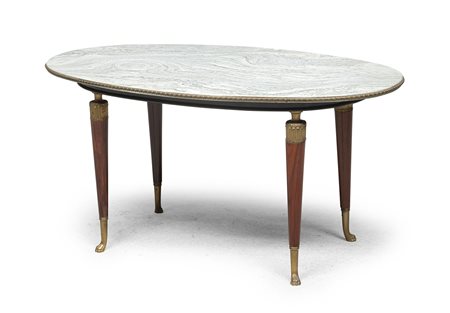con piano ovale in marmo greco scritto. Base in faggio con gambe coniche con finali e apici in metallo dorato.