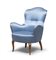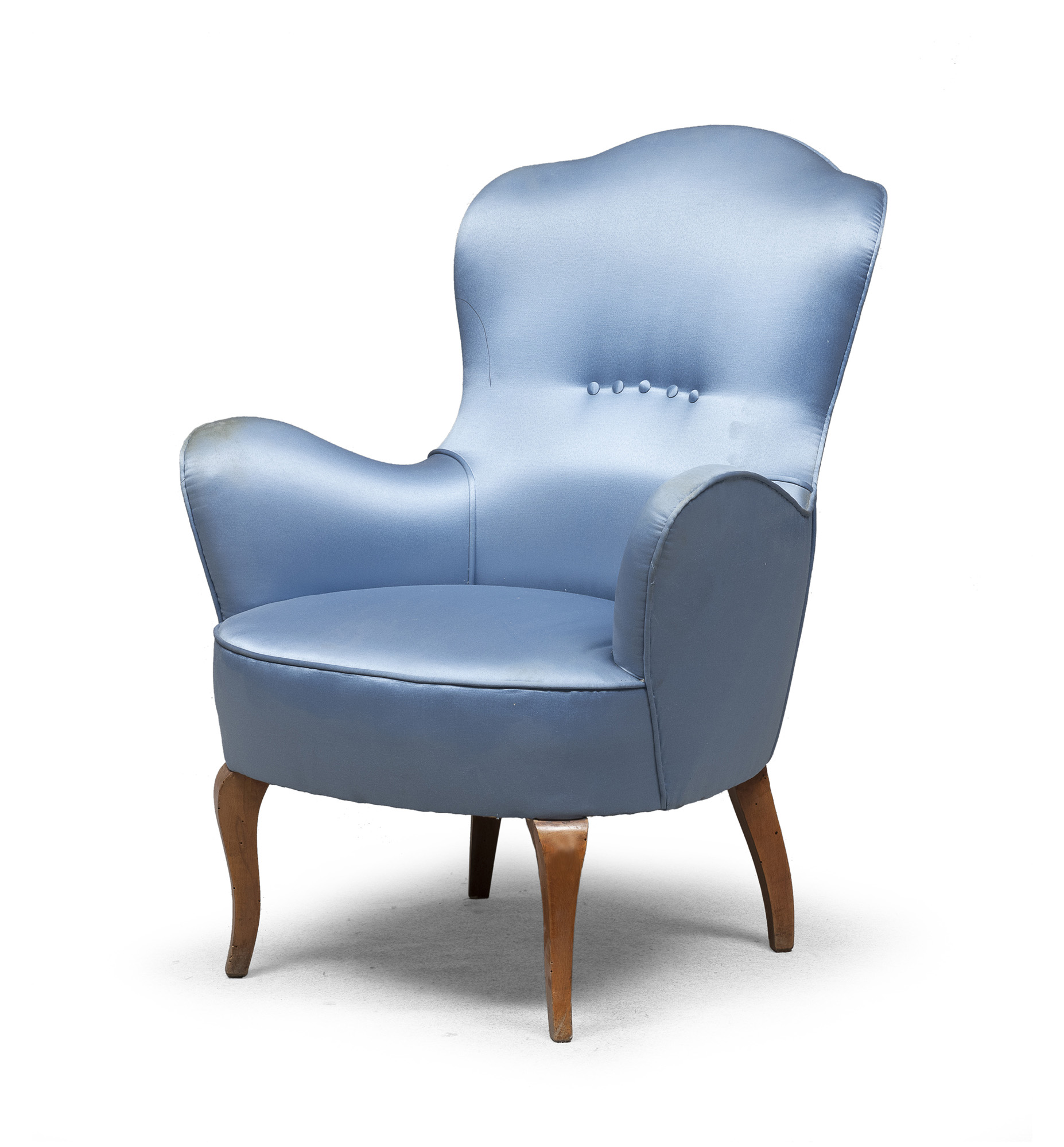 con schienale a scudo e braccioli ad medaglione. Gambe in acero con le anteriori a spalla larga. Bella tappezzeria in raso azzurro.
