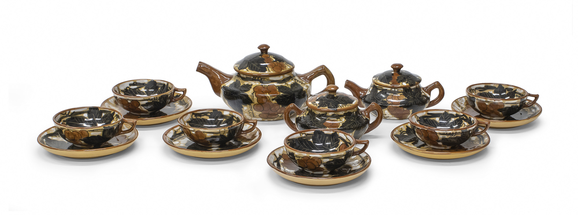 con decoro a tralci d'uva a fondo marrone. Composto da teiera, zuccheriera, lattiera, sei tazzine e sei piattini.