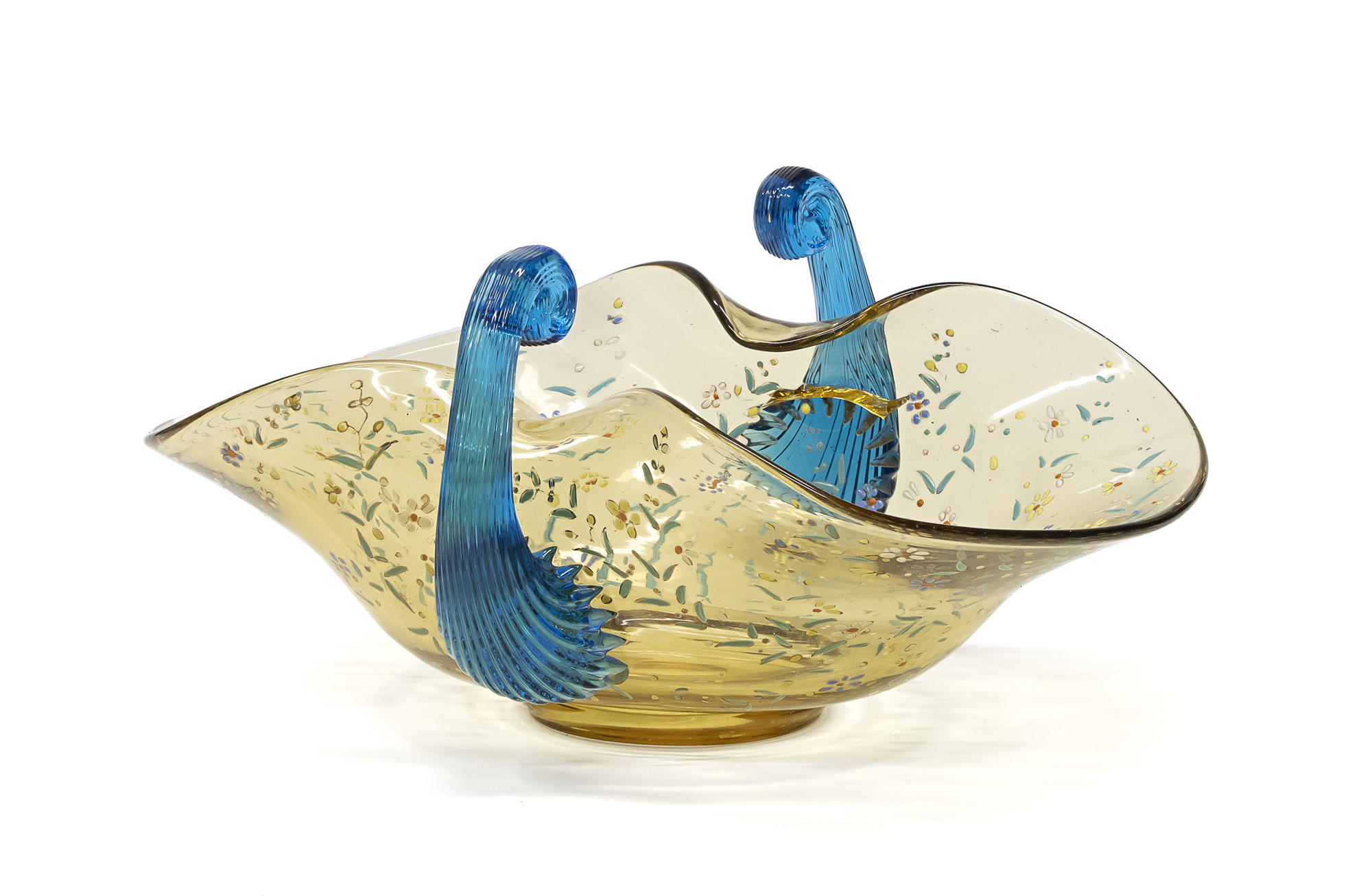 a fondo trasparente, dipinto a motivi floreali, manici a bastoncello in pasta di vetro azzurra.