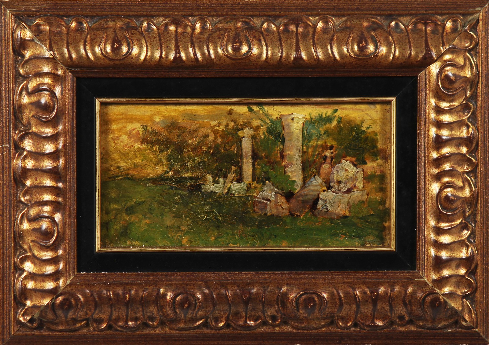 ARTISTA DEL XIX SECOLO Paesaggio con ruderi. Olio su tavola. Cm 22,00 x 12,00. . Cornice presente