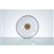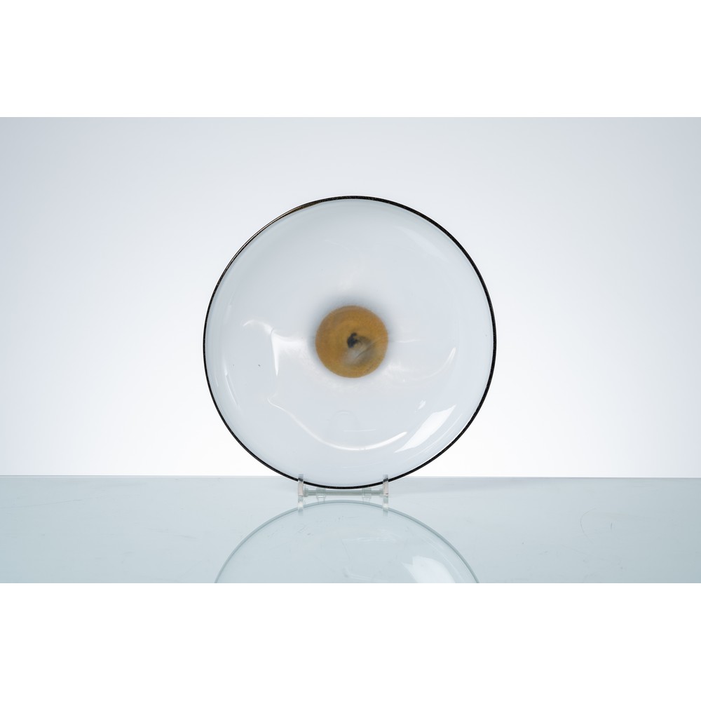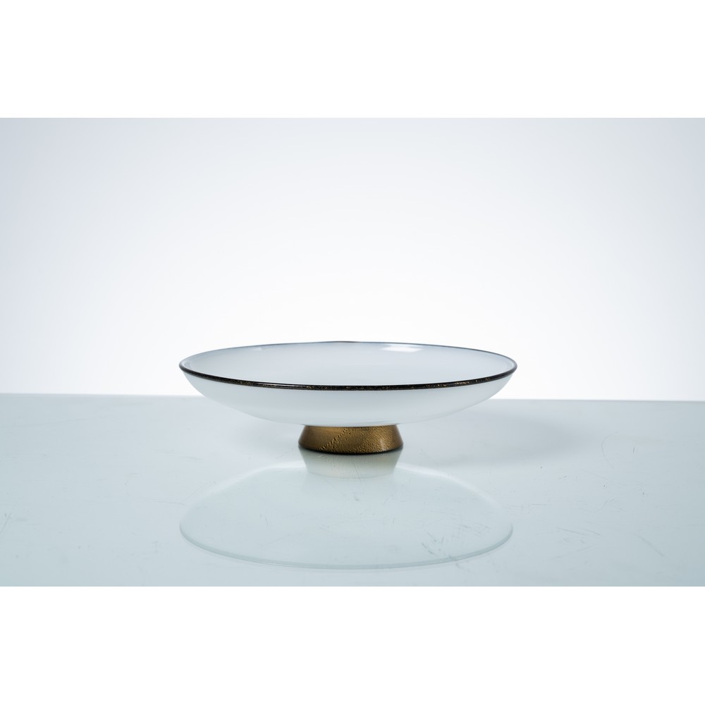 Centrotavola della serie “Primavera” in vetro soffiato lattimo con corpo circolare, piede e bordo in vetro nero con inclusione oro. Firma incisa a punta "Barovier e Toso Murano 120b".
