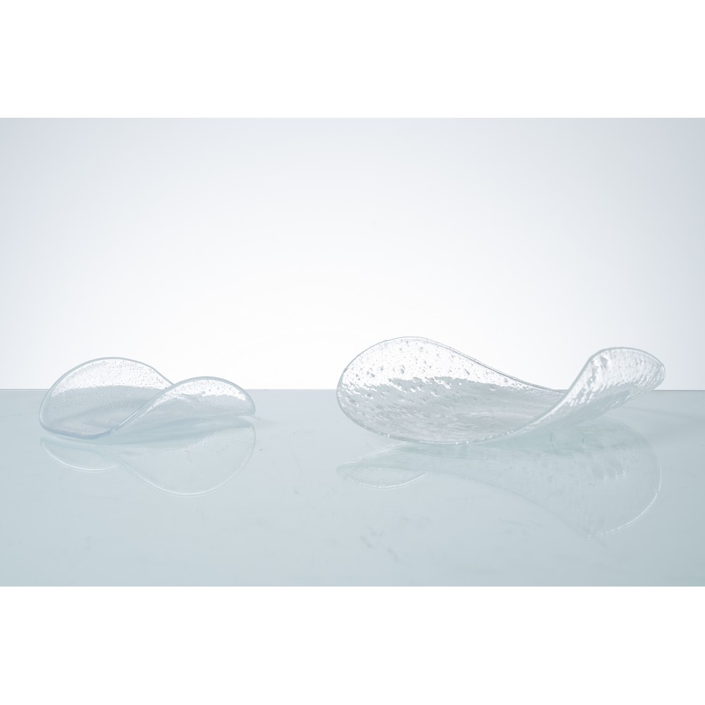 Due centrotavola della serie “Onde” modello “761” in vetro soffiato in colore cristallo con decoro in foglia argento, corpo a disco curvato. Firma all’acido “Venini 2003" (il grande), "Venini 2004" (il più piccolo).