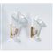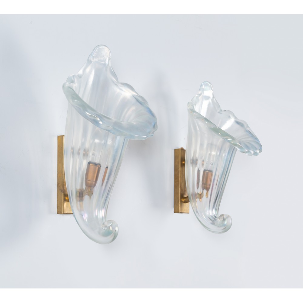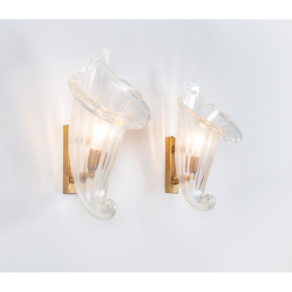 Coppia di lampade da parete ad una luce, struttura in ottone con diffusore a cornucopia in vetro trasparente iridato.