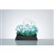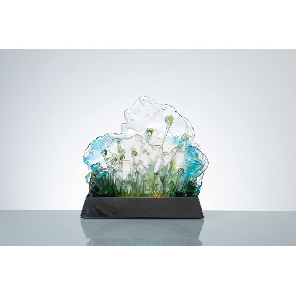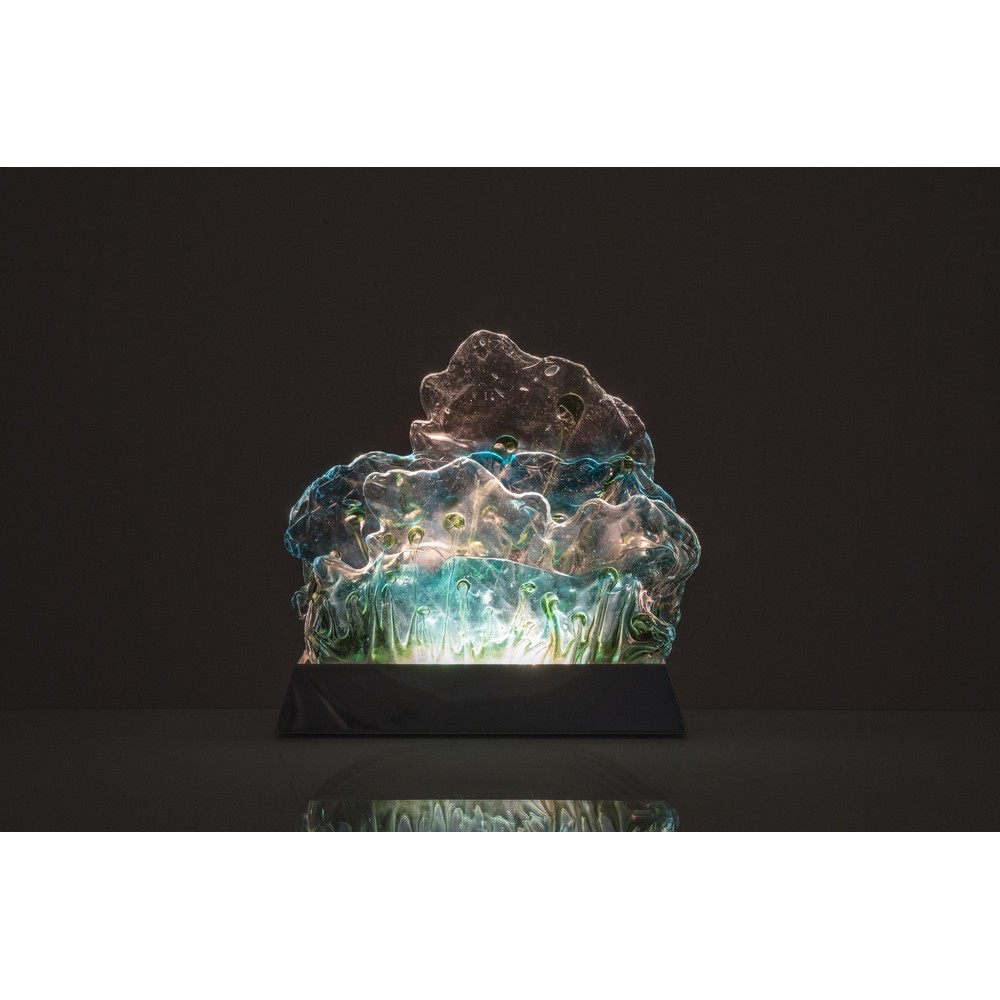Lampada da tavolo ad una luce modello “Acquario”, struttura in acciaio cromato, diffusore composto da lastre di vetro sagomate a mano e sovrapposte, vetro ondulato e decorate in azzurro e verde.