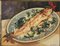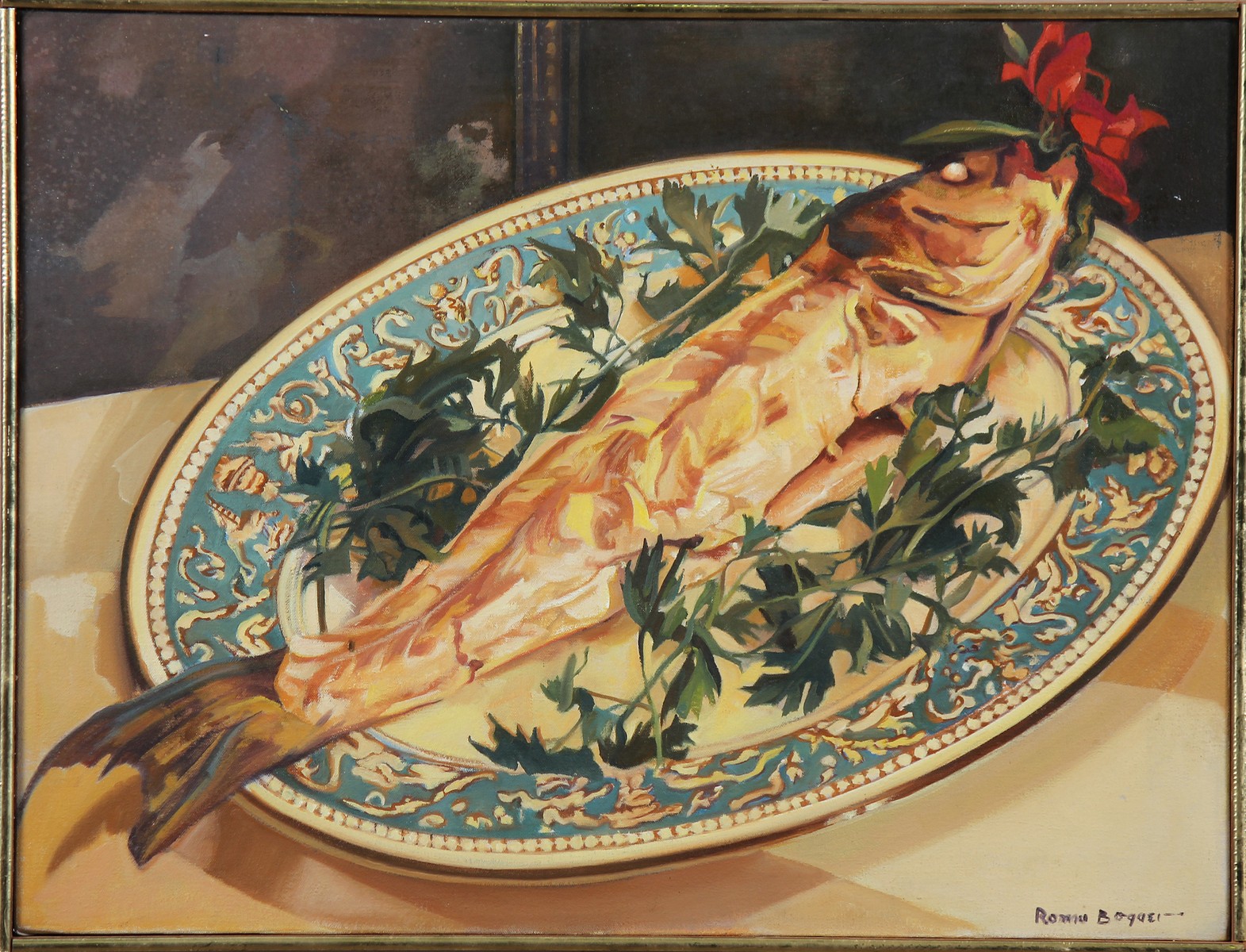 BOGAEV RONNI Dimitri' s Fish. 1987. Olio su tela . Cm 60,50 x 46,00 x 5,00. Firmato in basso a destra Ronni Bogaev. Al retro etichetta di Sharry French Gallery, inc. New York.