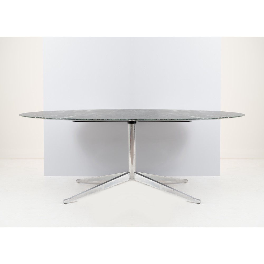 Tavolo da pranzo modello “2480 Oval 96”, piede in acciaio cromato cruciforme, piano ovale in marmo verde delle alpi.
