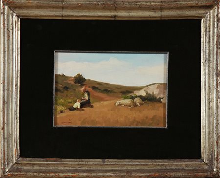 GIACOBBI ERNESTO (1891 - 1964) Pastorella e paesaggio. Olio su tavola. Cm 28,50 x 18,50. Firma in basso a sinistra. Cornice presente