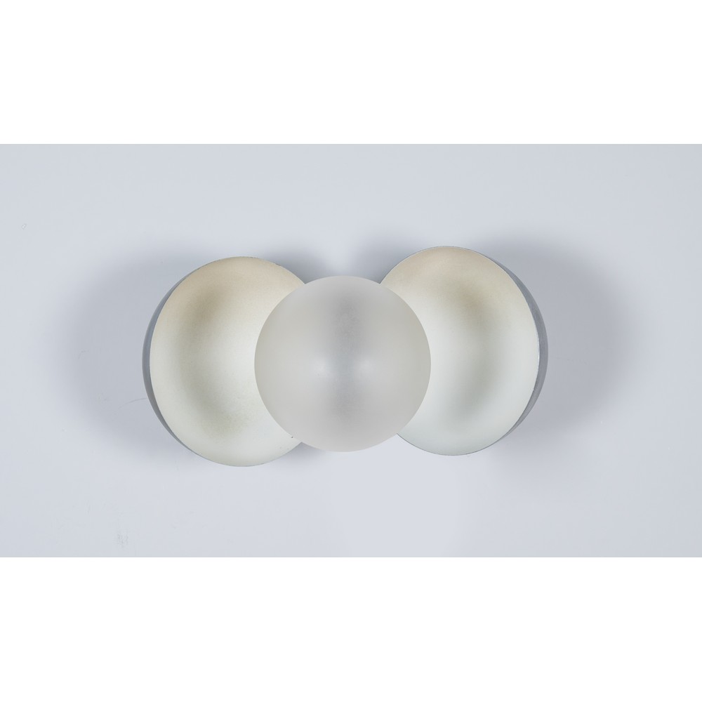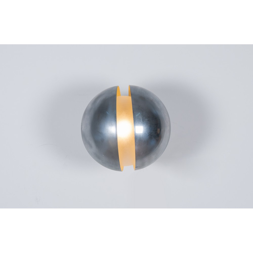 Lampada da parete modello “Diaframma” con struttura mobile in ottone cromato e diffusore sferico in vetro satinato. (Piccola rottura nella parte ad incastro, non visibile a lampada montata).