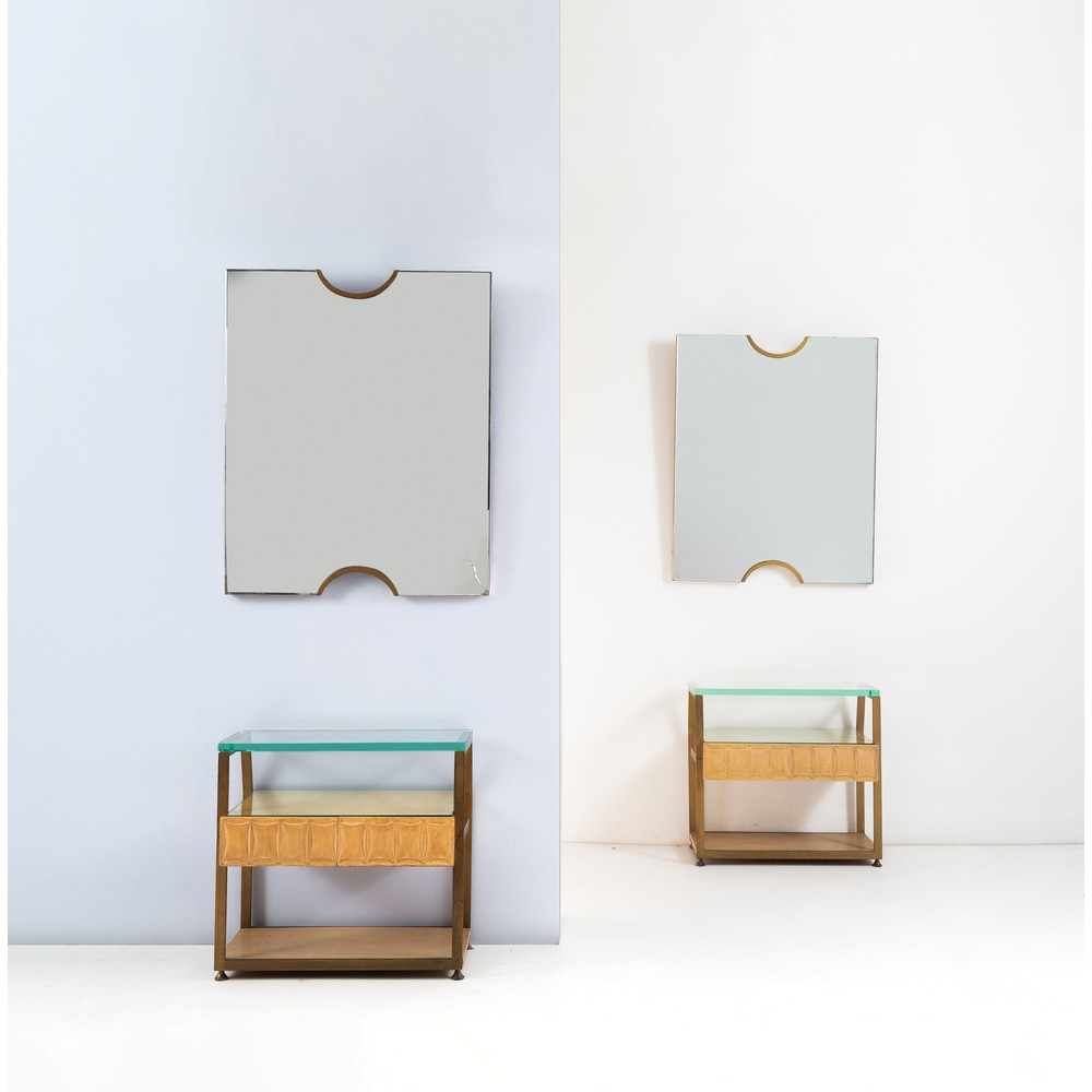 Coppia di comodini con specchiere sovrastanti, struttura in ottone, sul fronte un cassetto sospeso in legno decorato con bugne, piano rettangolare in cristallo trasparente di grosso spessore. Sulla parte superiore uno specchio con cornice in ottone e cristallo specchiato.