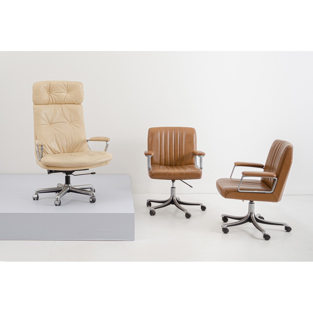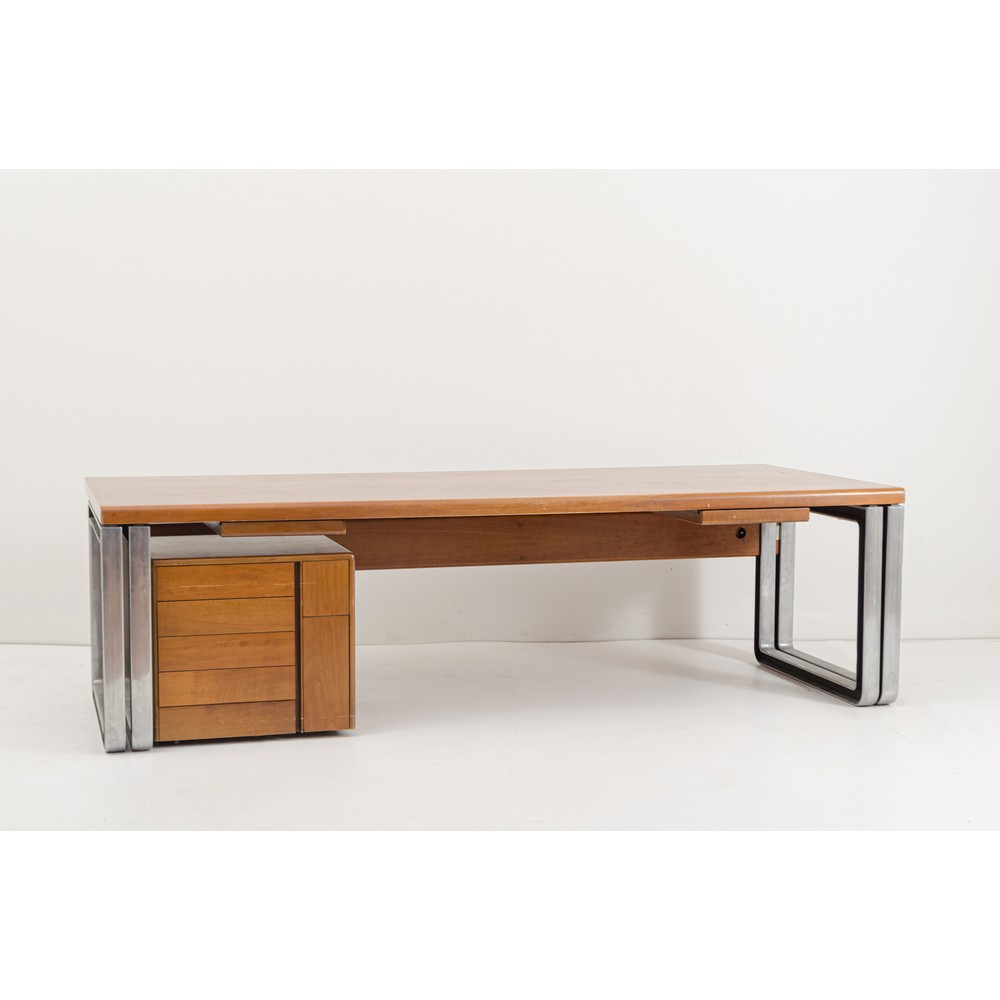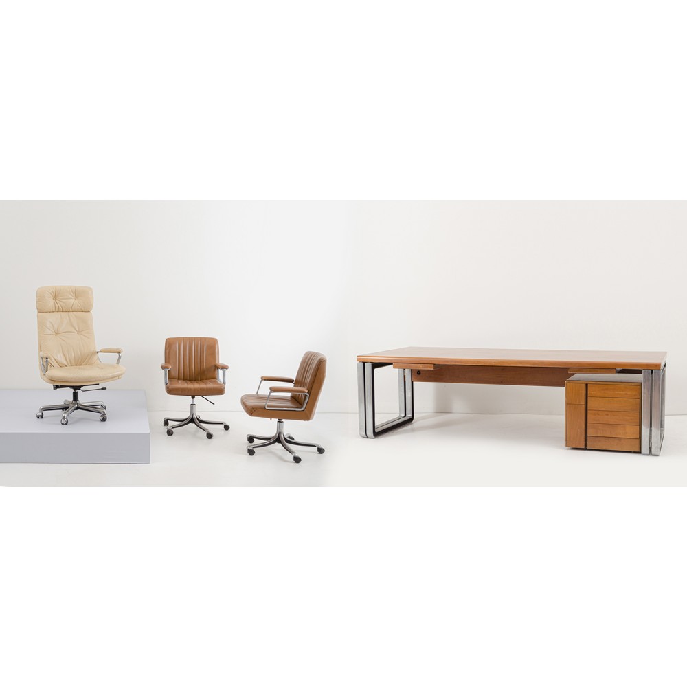 Una scrivania modello "T333" in fusione di alluminio e legno di noce, piano rettangolare, cuoio. Una cassettiera con cinque cassetti e due vani chiusi. Due poltrone modello "P125" (1966) con struttura in alluminio pressofuso, imbottiture e rivestite in pelle marrone. Una poltrona con schienale alto e struttura in metallo cromato, imbottitura e rivestimento in pelle avorio.