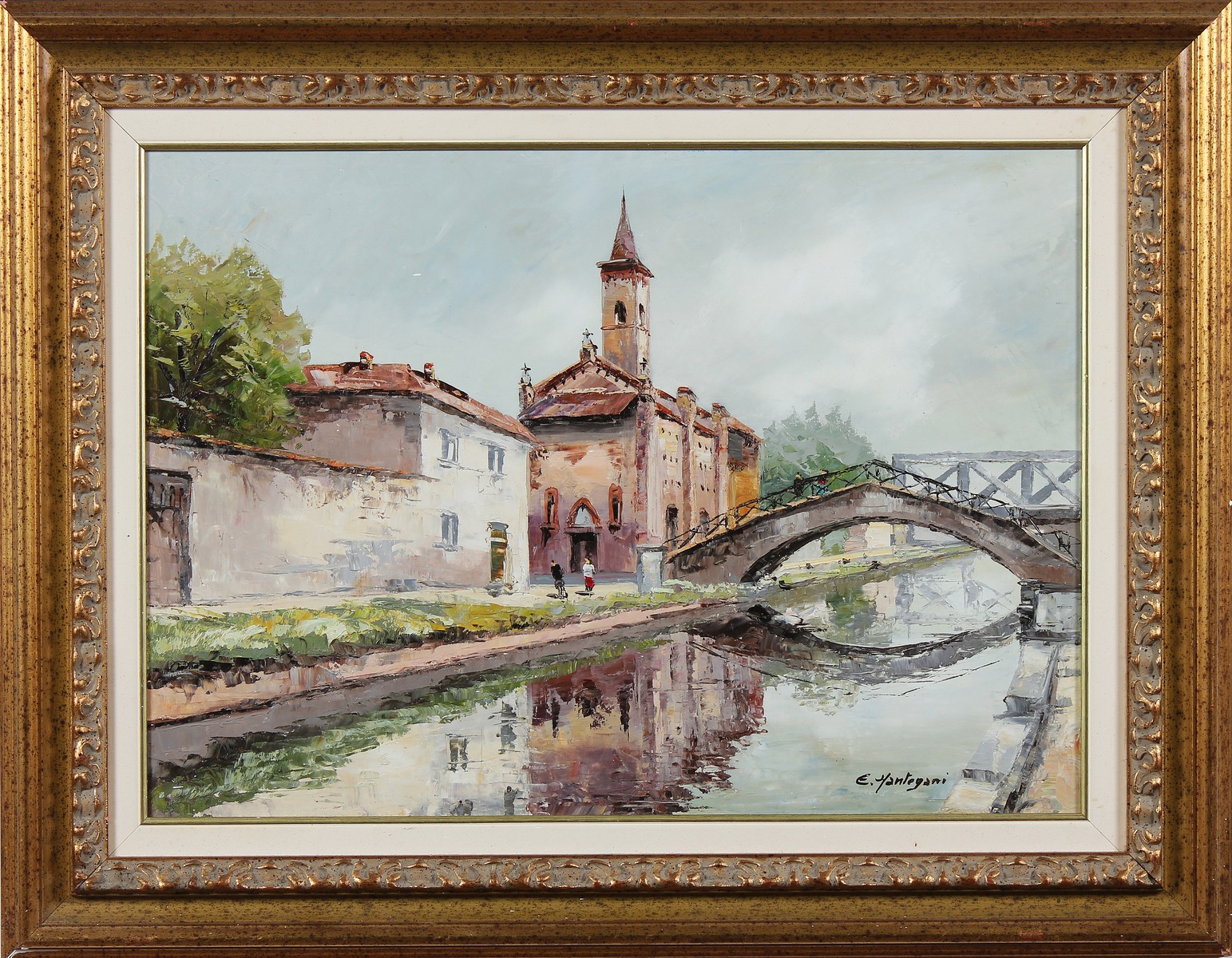 MANTEGANI EUGENIO (1929 - 2005) San Cristoforo, Milano. Olio su tela . Cm 70,00 x 50,00. Firma in basso a destra. Al retro firma e titolo. Cornice presente