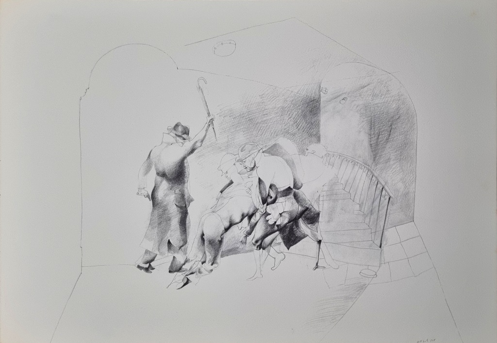 ATTARDI UGO Sori 1923 - Roma 2006 "Bisogna dargli in testa" Riproduzione litografica di opere eseguite dal Maestro, cm 49x34. Firmata e datata sul fronte in basso a destra.
