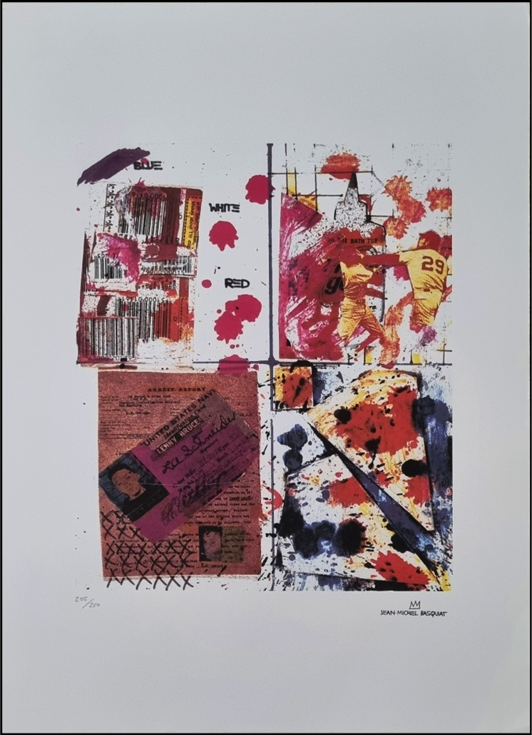 BASQUIAT JEAN-MICHEL New York 1960 - 1988 "Senza titolo" Litografia offset su cartoncino, cm 50x70. Firma in stampa sul fronte in basso a destra, tiratura a matita 205/250 e timbro a secco in basso a sinistra.