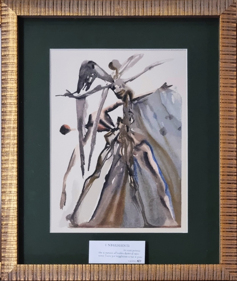DALI' SALVADOR Spagna 1904 - 1989 "I negligenti" Xilografia su carta cm 21x27. Esemplare 1938/2900. Sul retro etichetta descrittiva a cura della Galleria Bottega D'arte (Matera). Tavole ispirate alla Divina Commedia. Opera incorniciata.
