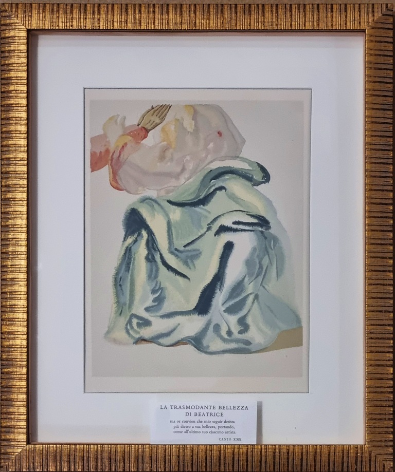 DALI' SALVADOR Spagna 1904 - 1989 "La trasmodante bellezza di Beatrice" Xilografia su carta cm 21x27. Esemplare 1938/2900. Sul retro etichetta descrittiva a cura della Galleria Bottega D'arte (Matera). Tavole ispirate alla Divina Commedia. Opera incorniciata.