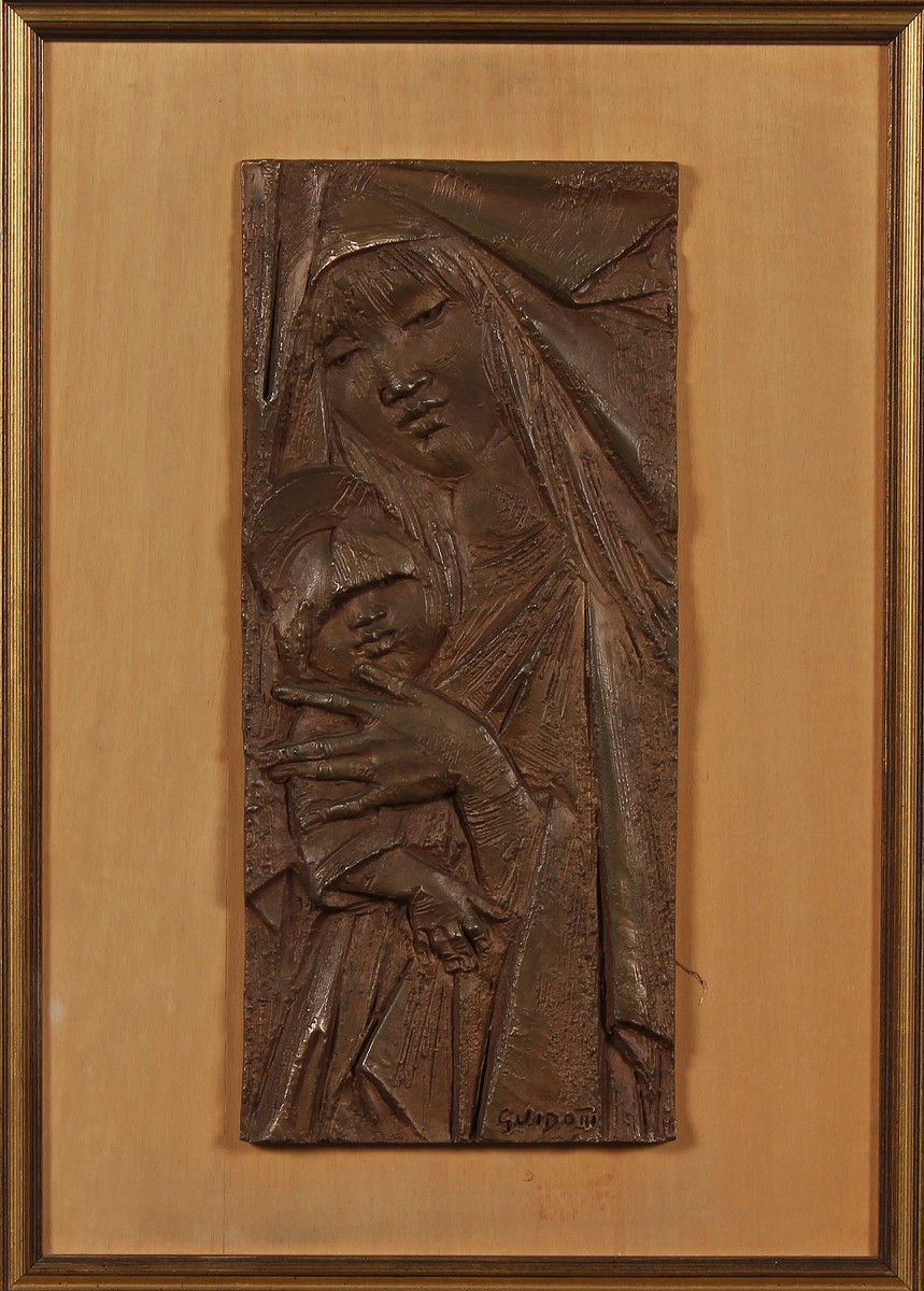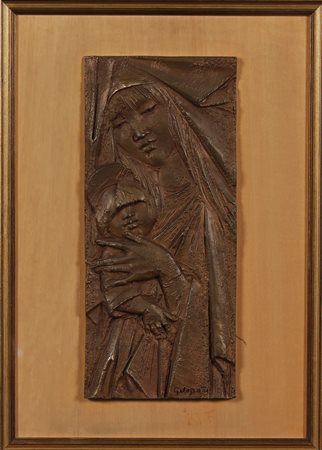 GUIDOTTI FERRUCCIO (1931 - 2012) Madonna con Bambino. Bronzo. Cm 18,00 x 40,00. Firmato in basso a destra. Cornice presente