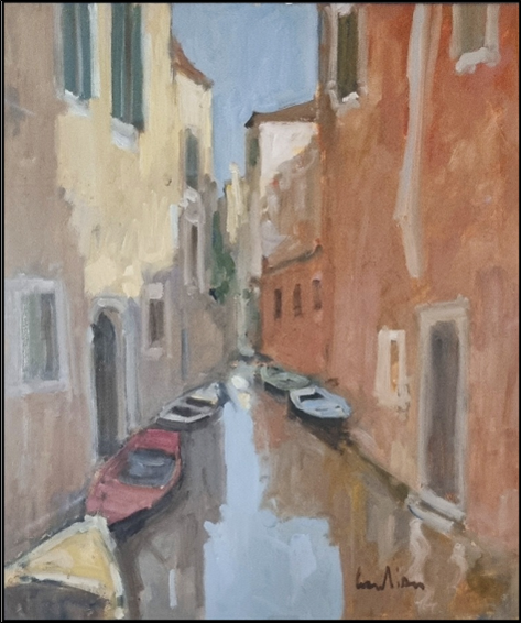 CANDIAN ALBERTO Venezia 1946 "Rio Veneziano" Olio su tavola cm 60x70 del 2002. Firmato sul fronte in basso a destra. Sul retro titolo, firma ed etichetta descrittiva.