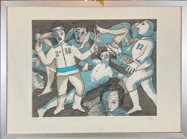 Lotto 803 | Enrico Baj "Duello tra soldati" 1972 acquaforte a colori (lastra cm 37x48; fogli