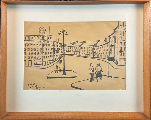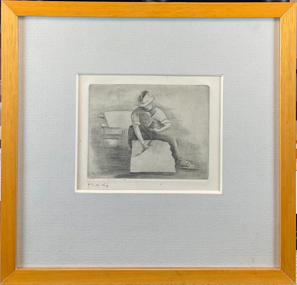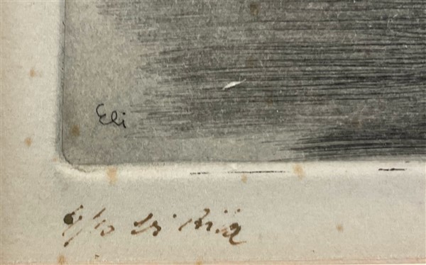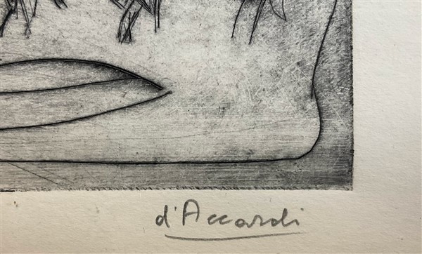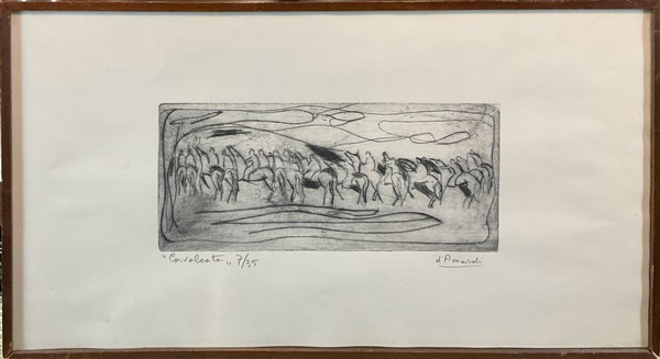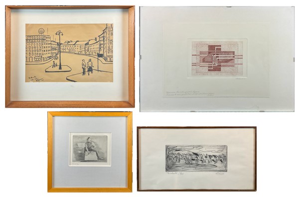 Lotto composto da tre acqueforti rispettivamente di Salardi, D'Accardi e Eli, di soggetto e misure diverse (misura max foglio cm 25x35) firmate e un pennarello su carta raffigurante paesaggio con figure (cm 23,5x34) firmato, iscritto e datato 1955 in basso a sinistra