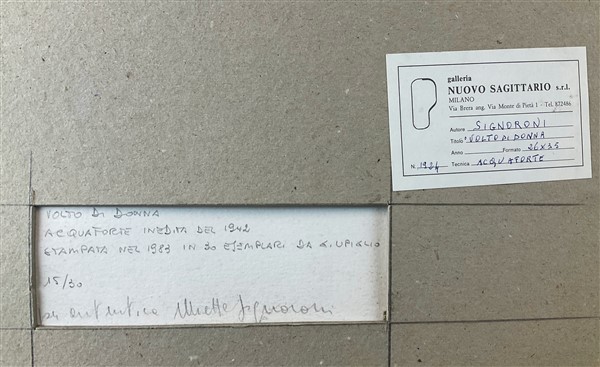 iscritta al retro a matita "Volto di donna. Acquaforte inedita del 1942 stampata nel 1983 in 30 es. da Upiglio, 15/30. Per autentica Miette Signoroni". In cornice