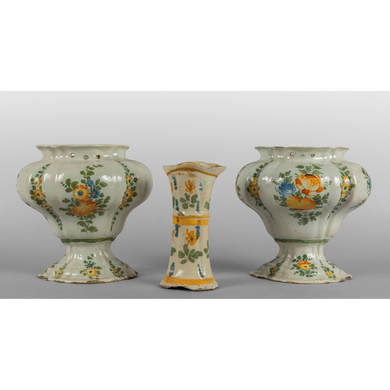 Coppia di vasi ed un vasetto in ceramica decorazione a fiori policromi su fondo bianco