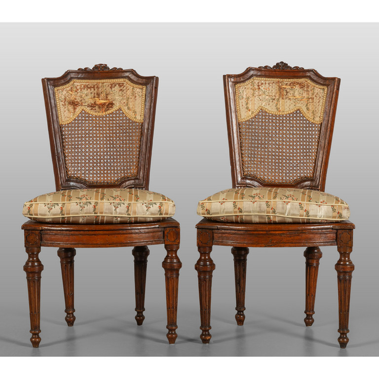 Coppia di sedie Luigi XVI in noce schienale a scudo con cimasa gambe intagliate e controintagliate Genova II metà sec.XVIII